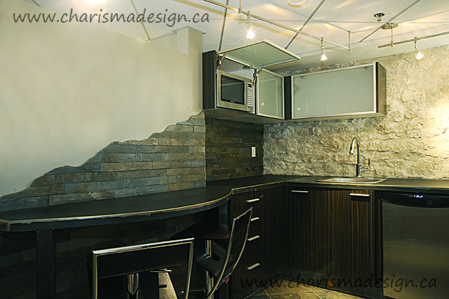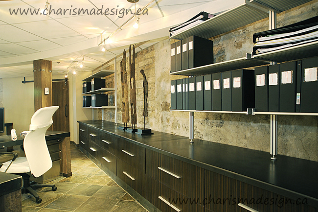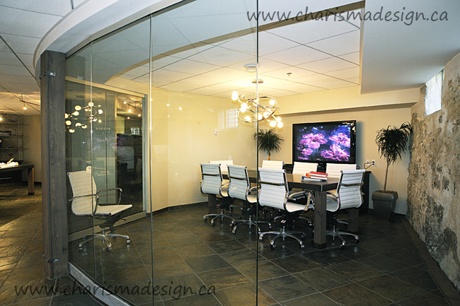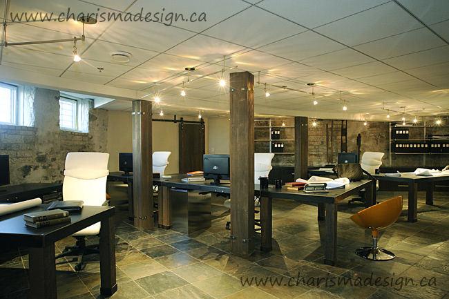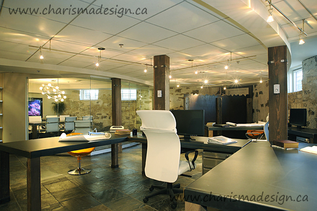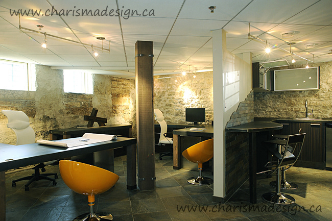 Basement renovation for a Winnipeg based Engineering firm. Offices are located in a converted church. We contrasted the rough & raw materials with modern furnishings & fixtures. We decided to leave the exposed foundation walls wherever possible.